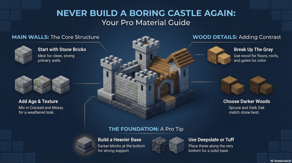 The Base (The Bottom) Here is a pro tip: Use darker blocks at the very bottom of your walls. Blocks like Deepslate or Tuff look heavier than normal stone. If you put them at the bottom, it makes your castle look like it has a strong foundation holding it up.