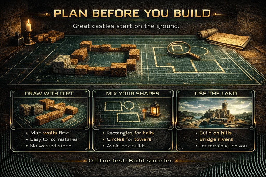 - Plan With Dirt: Don’t start placing stone immediately. Use dirt blocks to “draw” your castle outline on the ground first to check the size.