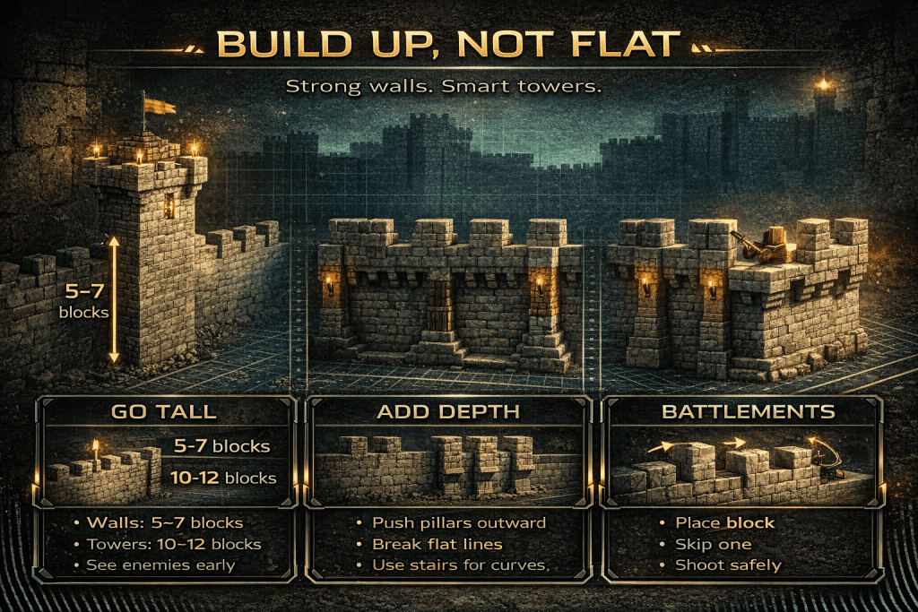 1. Go Tall Your walls need to be high enough to stop skeletons from shooting you. A good rule is to make your walls at least 5 to 7 blocks high. Your towers should be even taller maybe 10 or 12 blocks high. This helps you see enemies coming from far away.