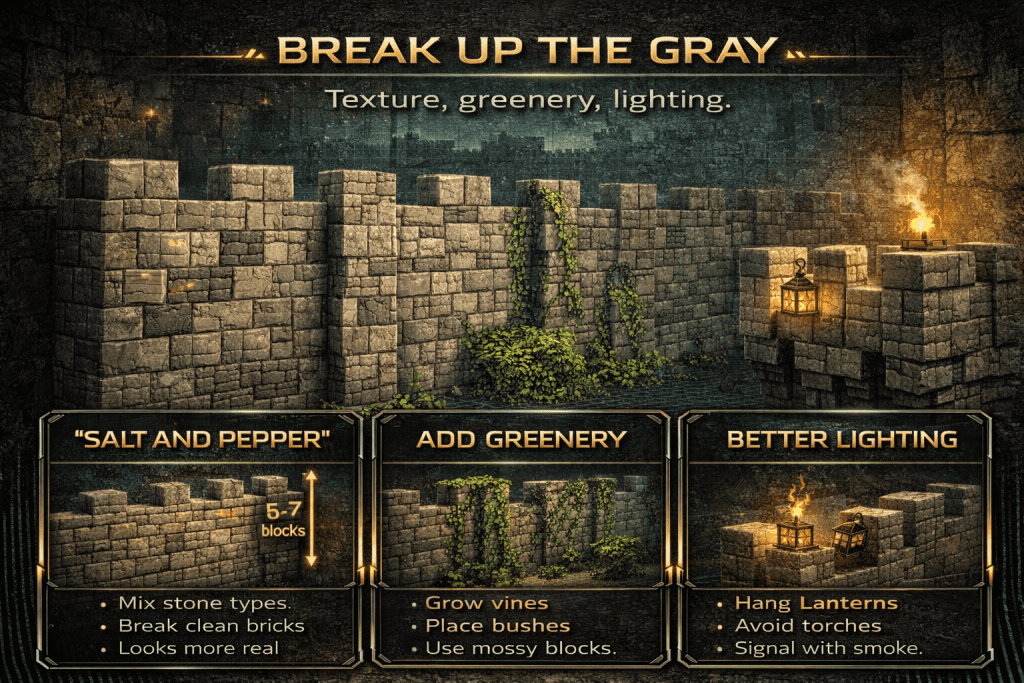 1. The “Salt and Pepper” Trick (Texturing) This is the secret used by all the best Minecraft builders. Don’t use just clean Stone Bricks. Randomly break a few blocks in your wall and replace them with Cobblestone, Andesite, or Cracked Stone Bricks. This breaks up the boring gray pattern and makes the wall look realistic.