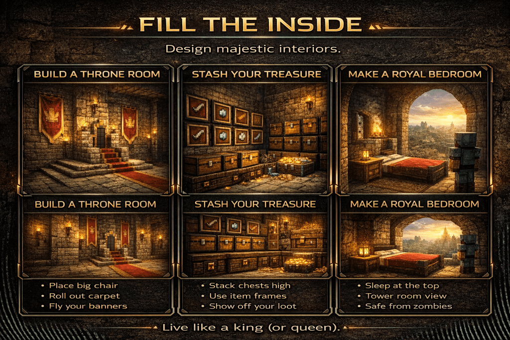 Now that the outside looks great, you need to fix the inside. A castle shouldn’t just be an empty stone box. You want it to feel like a real home for a king or queen.