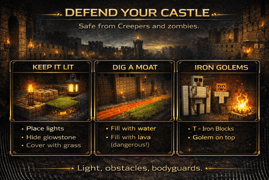 3. Hire Guards (Iron Golems) You don’t have to fight alone. You can build guards.